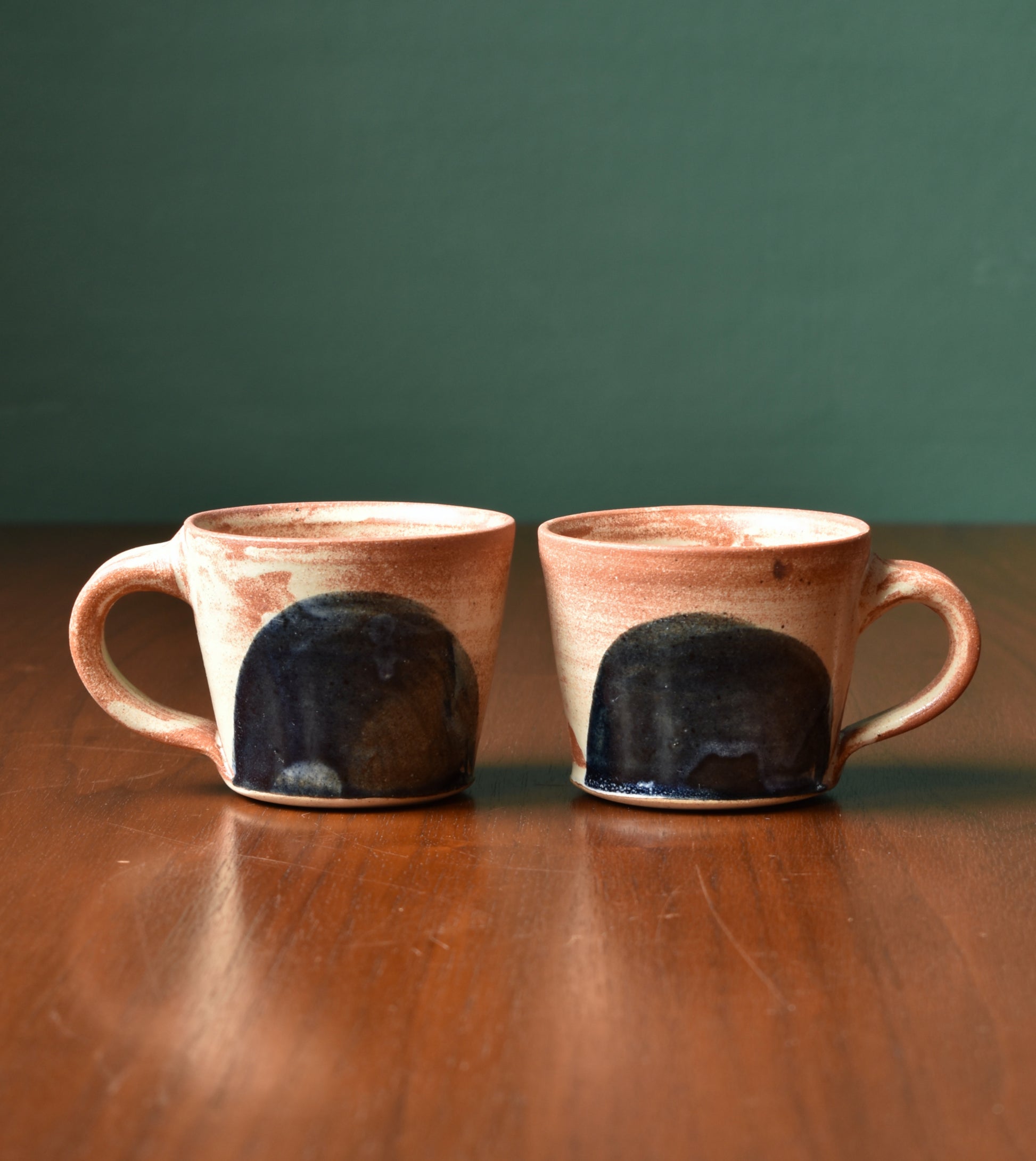 Handmade ceramic espresso mug, glazed in cream white satin matte and breaking rusty red over edges. Decorated with a cobalt blue arc on both sides.