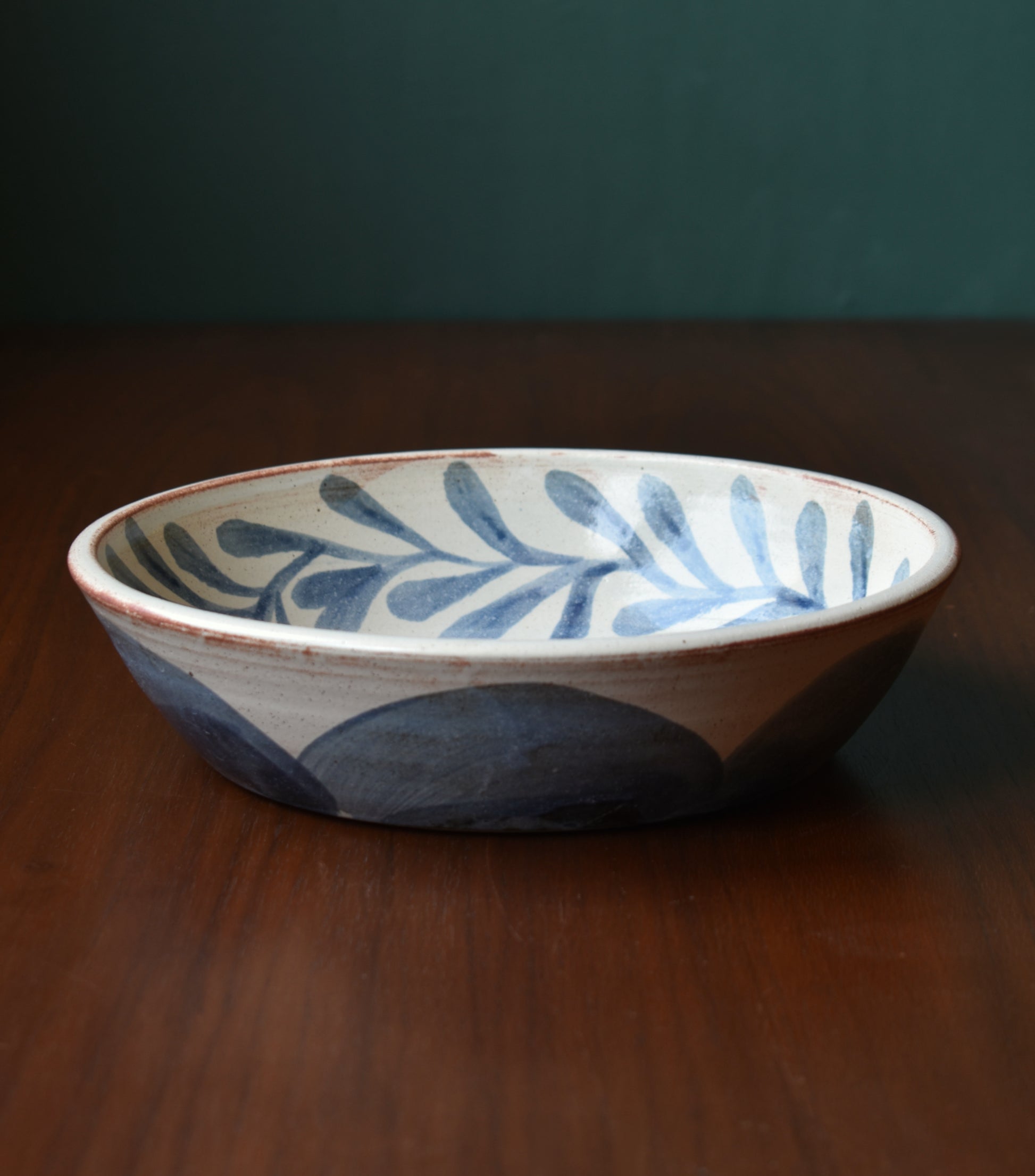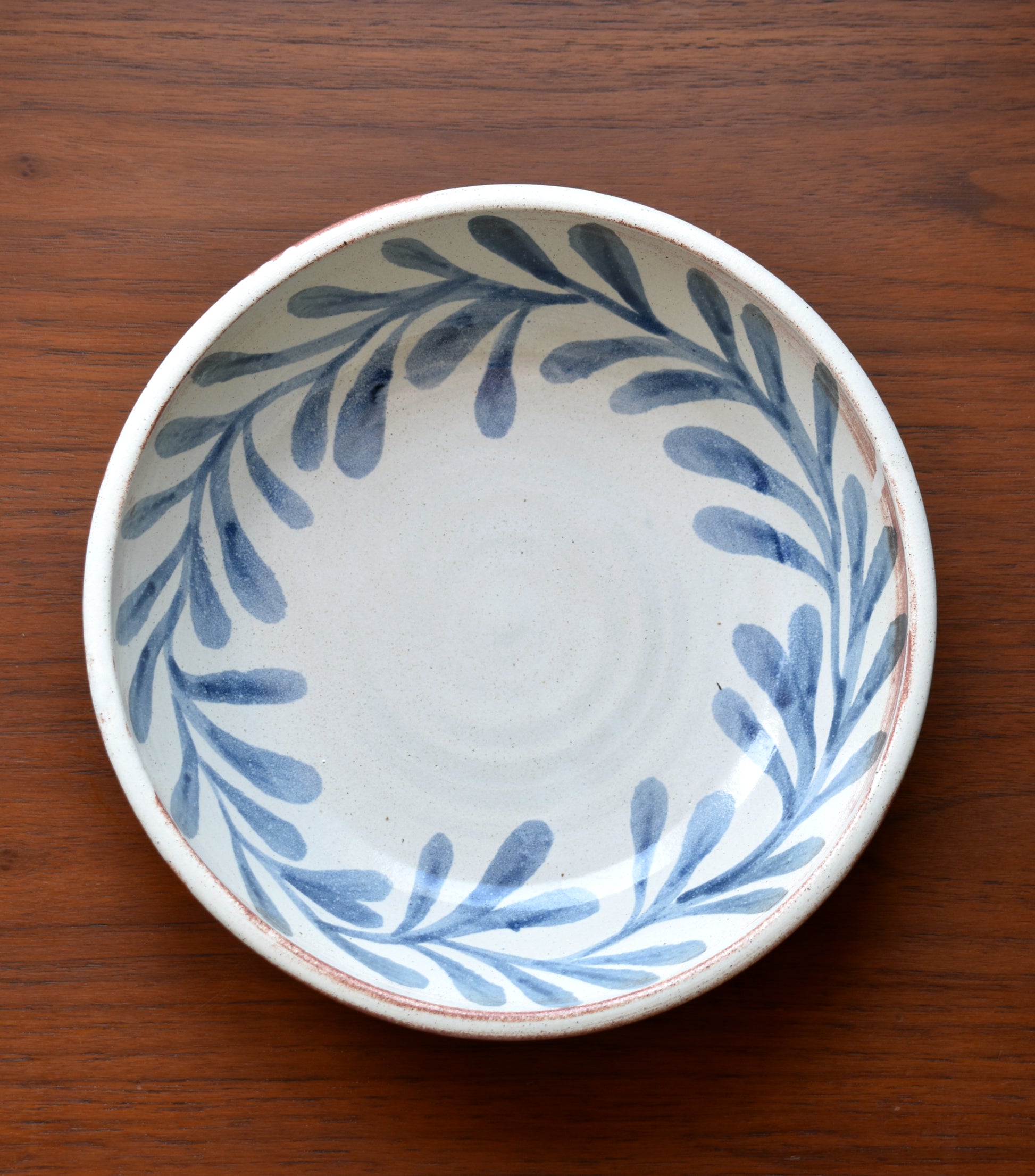 Large wheel-thrown ceramic serving bowl with painted floral decoration. Glazed in cream white with a semi-gloss finish, the bottom surface is unglazed. Dishwasher safe.