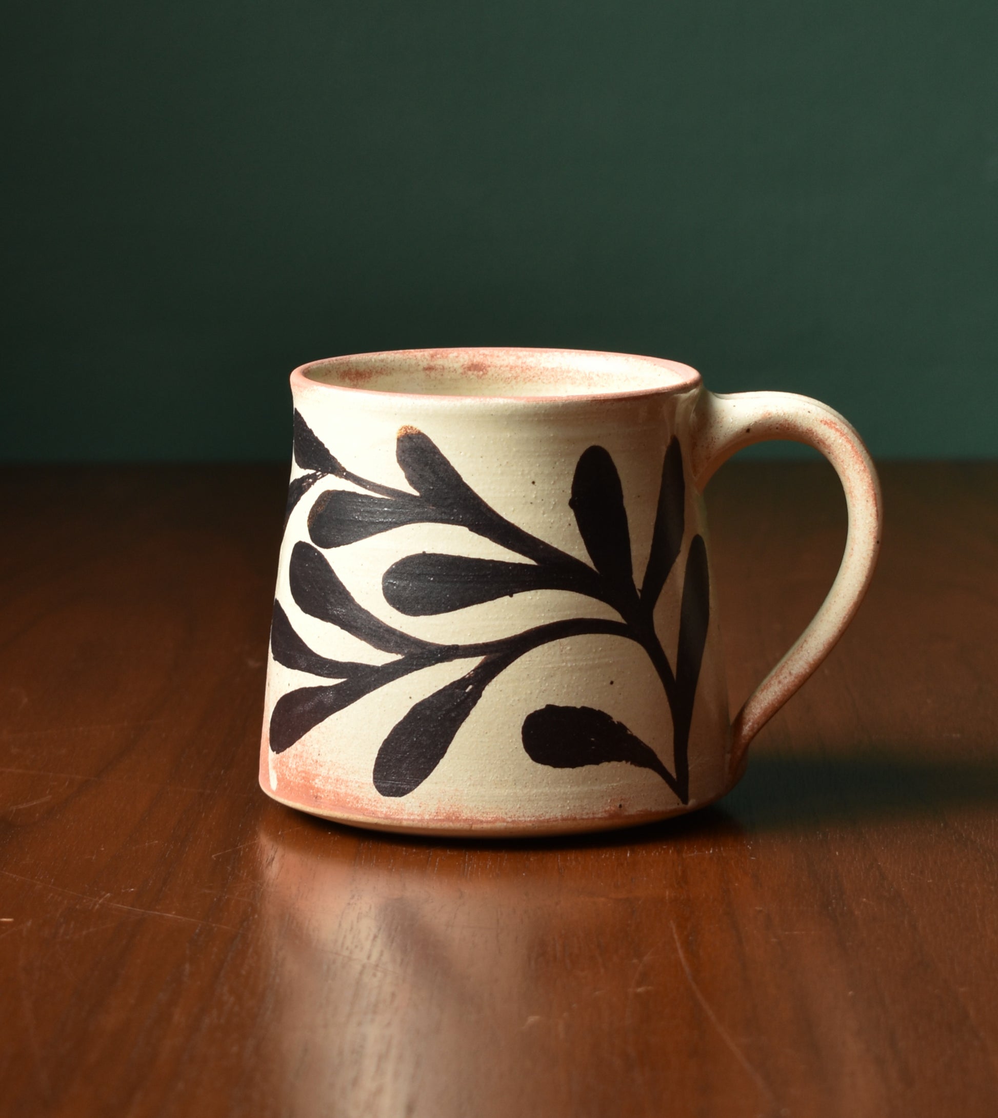 Handmade large ceramic mug with painted foliage decoration. Glazed in creamy warm white with a satin-matte finish and iron brushwork, breaking rusty red over edges. This mug is safe for the microwave and dishwasher.